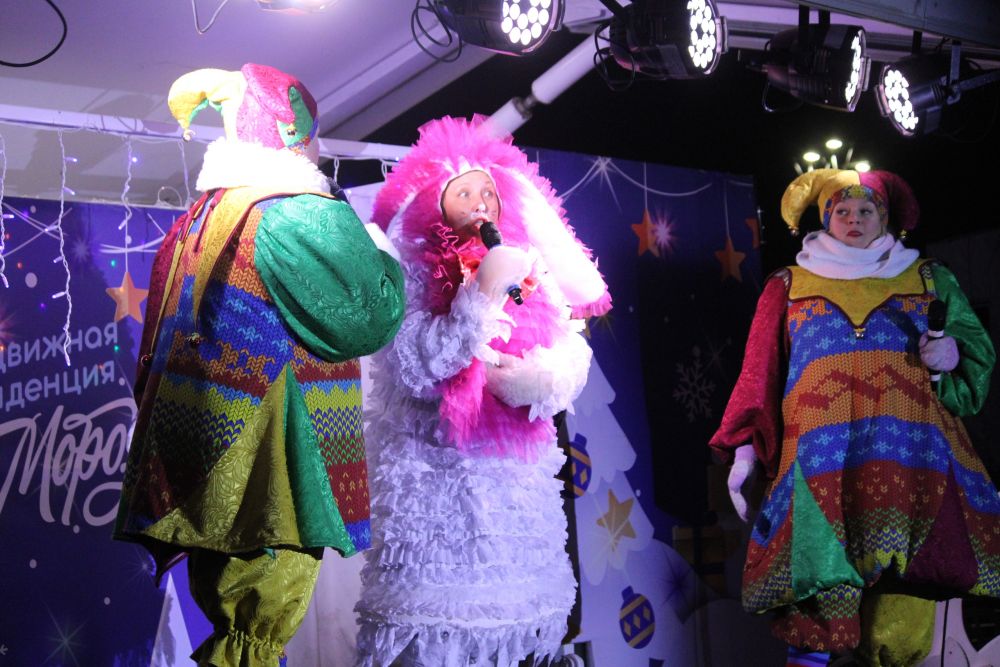 В центре площади разворачивается праздничное действо. Две задорные Потешины веселят публику, танцуют и играют. И хотя в этот день не было снега, но атмосфера волшебства всё равно присутствовала. К тому же, на помощь Потешинам пришли Зайка и Медведь.