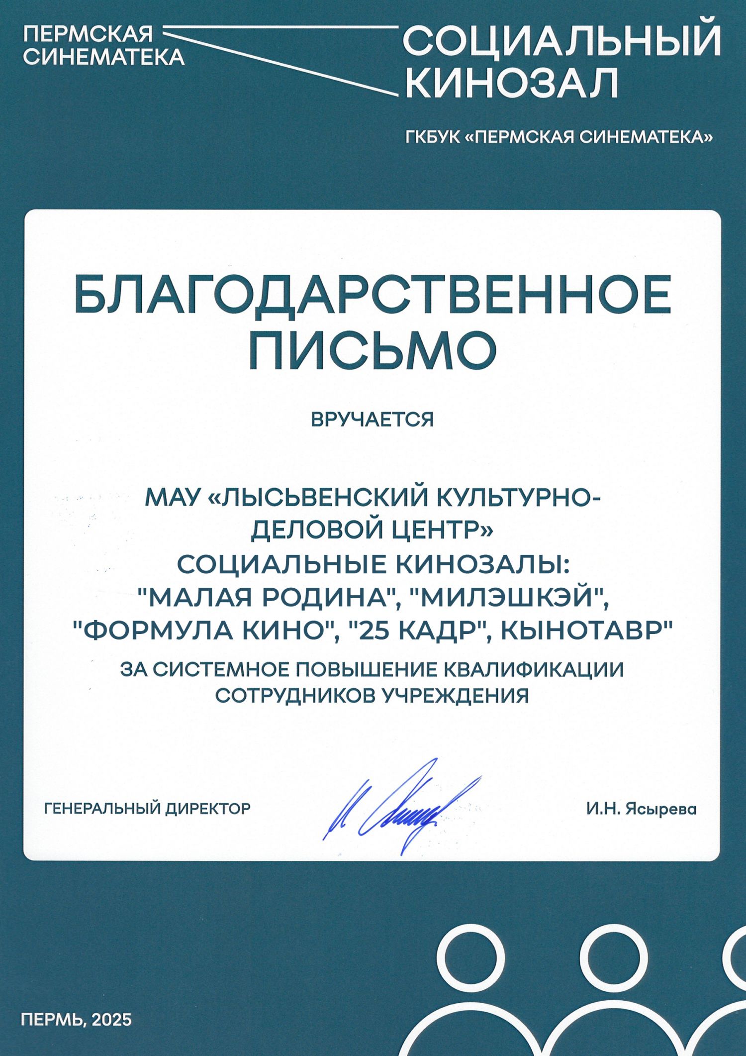 Социальные кинозалы Лысьвенского культурно-делового центра отметили благодарственными письмами за успешное внедрение платных показов и эффективную работу в этом направлении, а также за системное повышение квалификации сотрудников.