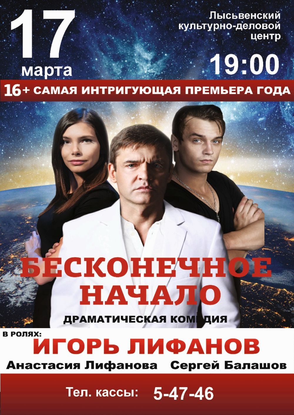 Главную роль в спектакле играет популярный артист Игорь Лифанов. В кино он больше известен как герой-любовник, брутальный, крепкий, не сомневающийся в себе суровый мужик. Роль в спектакле «Бесконечное начало» позволяет раскрыться всем граням актёрского мастерства этого актера. Здесь он бескомпромиссный, надежный и мужественный, И в то же время смешной и ранимый, переживающий и страдающий, сквозь слёзы открывающий свою Душу наизнанку.