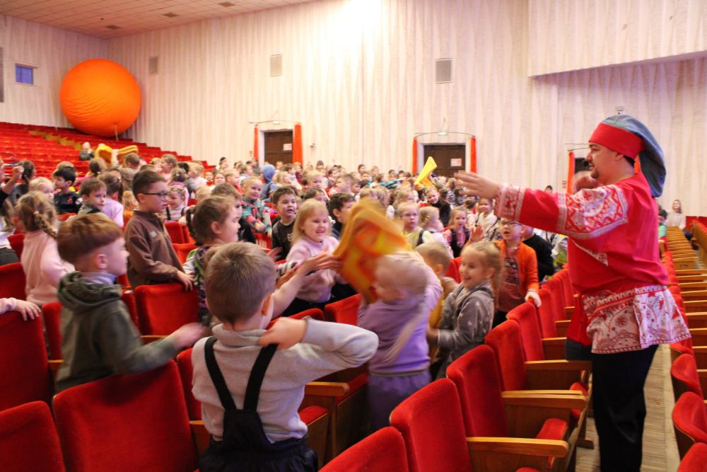 Ребятишки веселились от души. Сударыня Печка, Емеля, Кот Котофеич и Домованя играли, плясали, пели вместе с детьми.